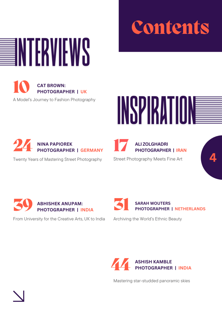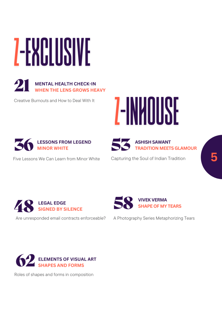 And that’s not all. each issue also offers photography quotes that hit like quiet awakenings, shines a light on an unsung yet remarkable personality, features honest reviews, introduces a freshly launched book straight from its author, and opens doors to an exciting photography contest—your chance to see your work published in our next issue.